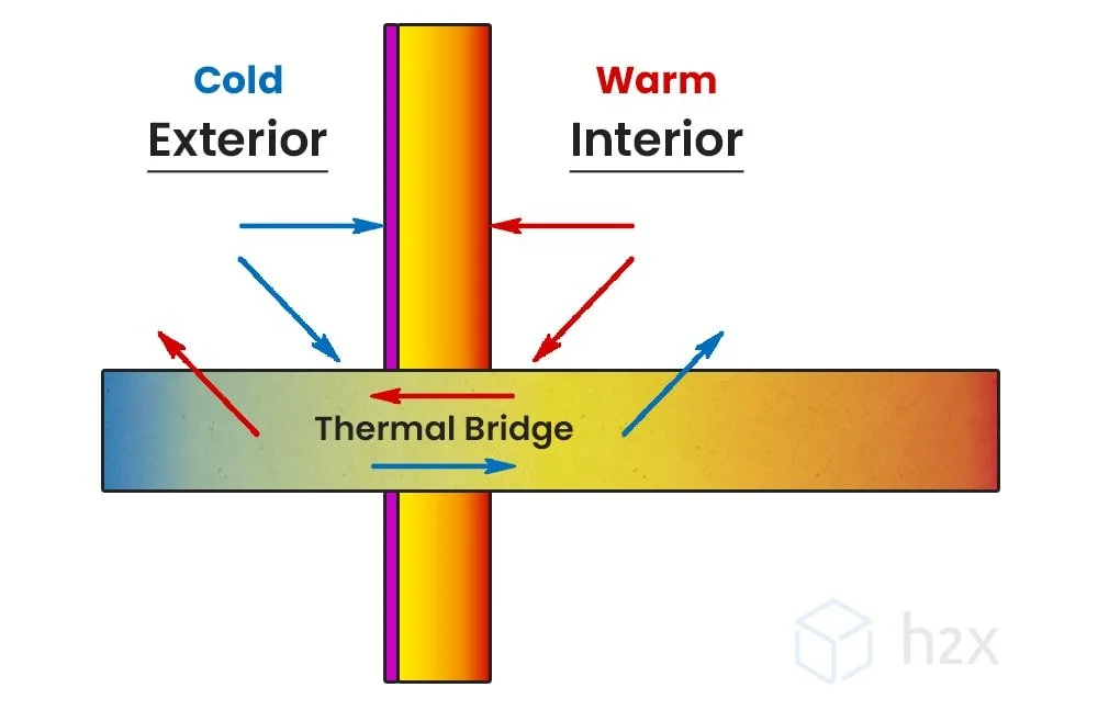 Thermal Bridging: Thermal bridging occurs when the walls are more conductive than the insulation. Thermal bridging is a main cause of heat lost in poorly insulated homes. It happens around doors and windows as well as studs.